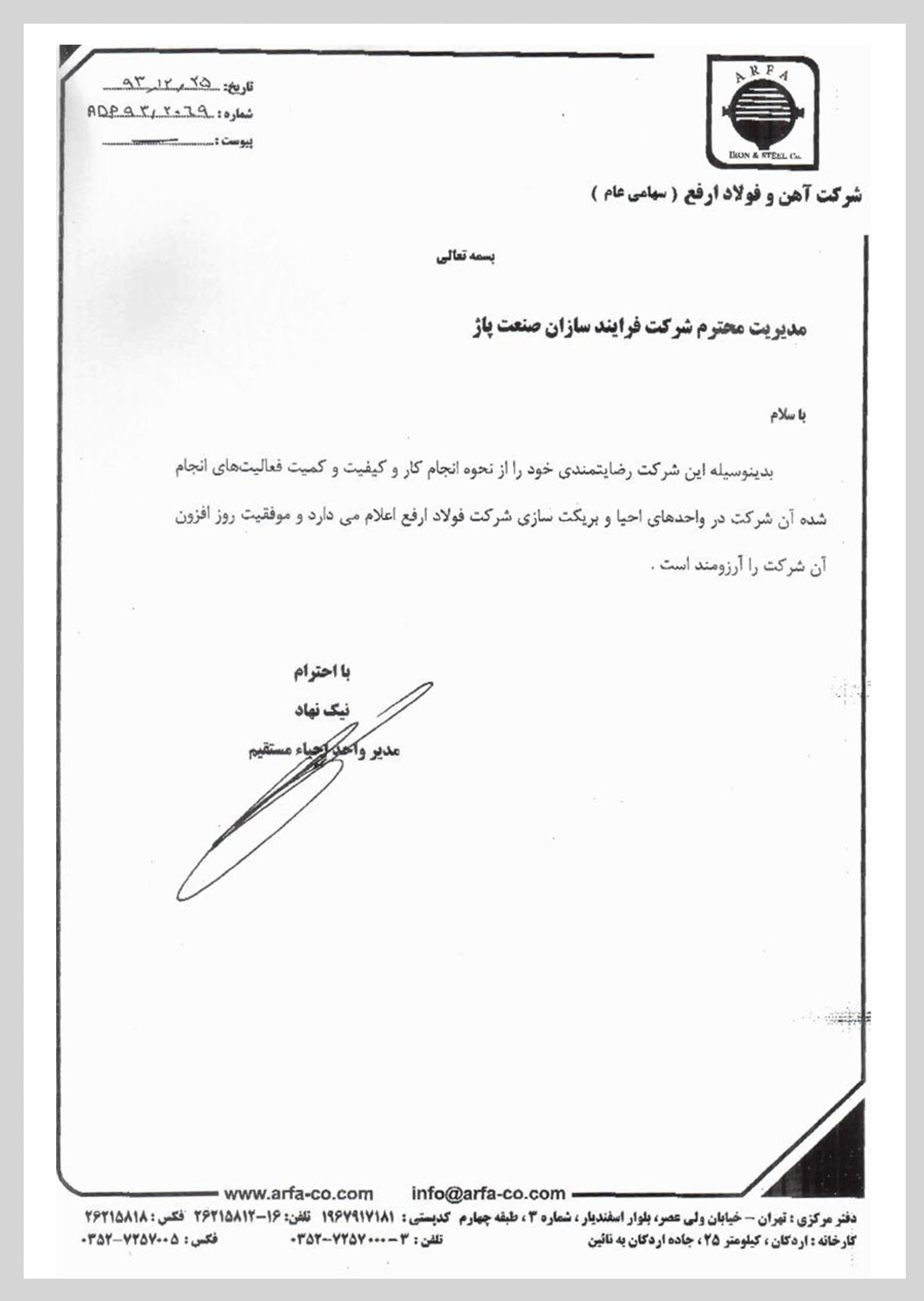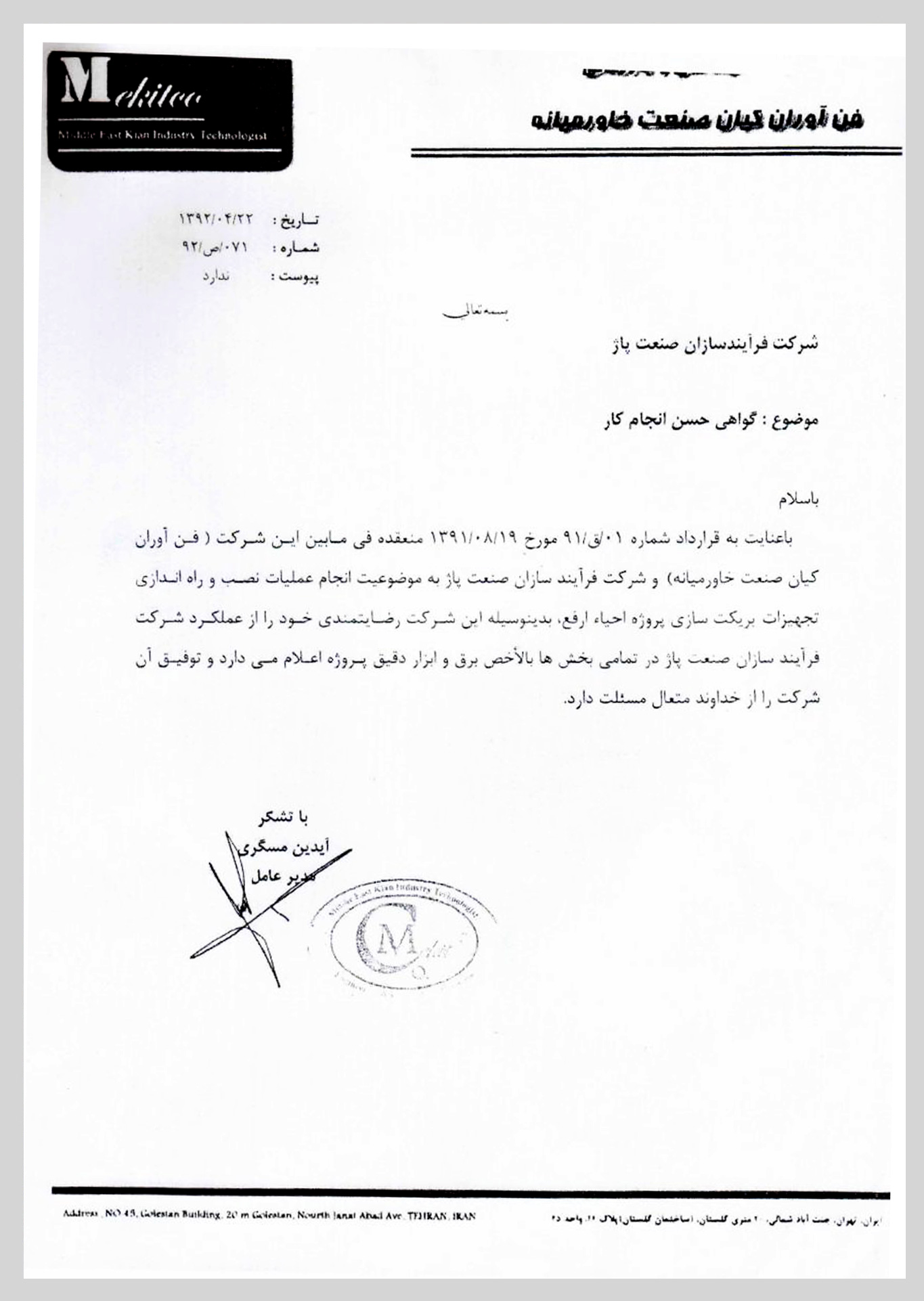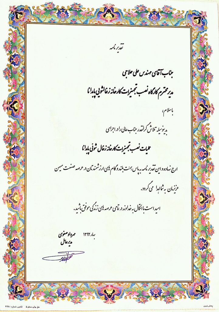 گواهی نامه های دریافتی شرکت فرایندسازان صنعت پاژ